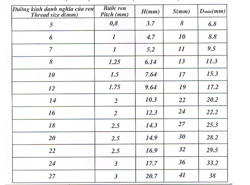 Bảng Quy cách sản phẩm Đai Ốc DIN 934 |
